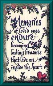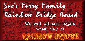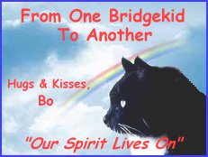 The Rainbow Bridge "Just this side of Heaven is a place called Rainbow Bridge. When an animal dies that has been especially close to someone here, that pet goes to Rainbow Bridge. There are meadows and hills for all of our special friends so they can run and play together. There is plenty of food and water and sunshine, and our friends are warm and comfortable. All the animals who had been ill and old are restored to health and vigor; those who were hurt or maimed are made whole and strong again, just as we remember them in our dreams of days and times gone by. The animals are happy and content, except for one small thing: they miss someone very special to them; who had to be left behind. They all run and play together, but the day comes when one suddenly stops and looks into the distance. The bright eyes are intent; the eager body quivers. Suddenly he begins to break away from the group, flying over the green grass, his legs carrying him faster and faster. YOU have been spotted, and when you and your special friend finally meet, you cling together in joyous reunion, never to be parted again. The happy kisses rain upon your face; your hands again caress the beloved head, and you look once more into the trusting eyes of your pet, so long gone from your life but never absent from your heart. Then you cross Rainbow Bridge together......." Author Unknown